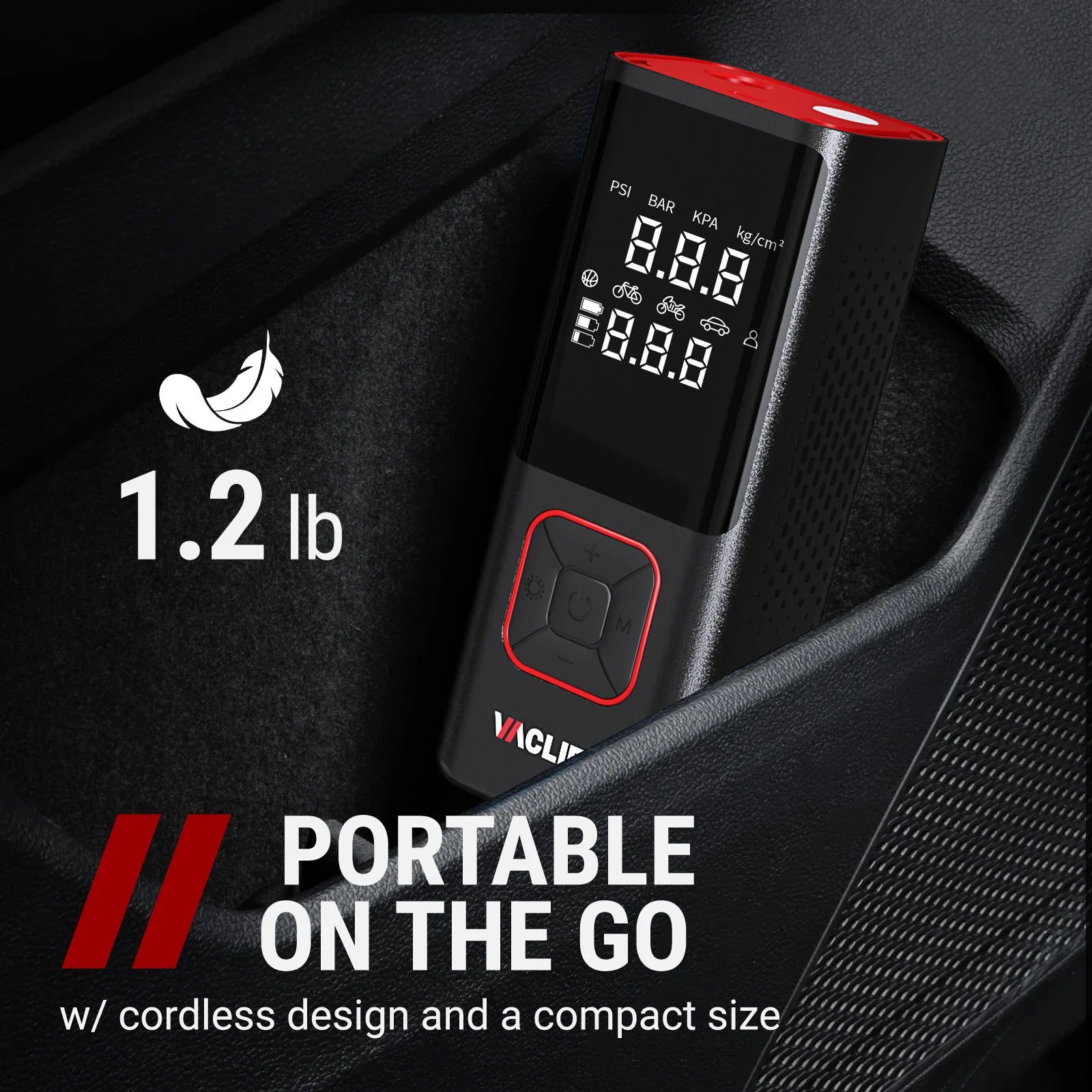 - PORTABLE AND CORDLESS DESIGN: VacLife portable air pump features a compact, cordless design that allows you to easily take it with you anywhere you go. It has four pressure units to choose from (PSI, BAR, KPA, and KG/CM²). With multiple attachments included, the VacLife cordless tire inflator is a must-have for drivers, cyclists, and adventurers.